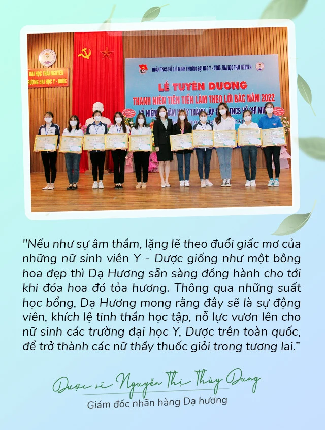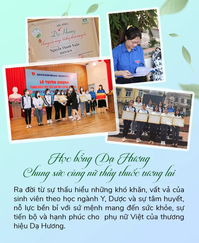 “Học bổng Dạ Hương – Chung sức cùng nữ thầy thuốc tương lai” được thành lập từ năm 2009 với sứ mệnh hiện thực hóa ước mơ trở thành nữ bác sĩ, nữ dược sĩ tương lai.