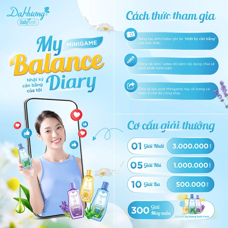 Tham gia và lan tỏa ngay Minigame cùng nhãn hàng Dạ Hương trong Tháng Tôn vinh phụ nữ này nhé. Nằm trong chiến dịch “Your Balance Diary”, minigame My Balance Diary là cơ hội để bạn tự do chia sẻ những khoảnh khắc nhỏ bé nhưng quý giá trên hành trình tìm kiếm sự cân bằng. Đó có thể là một buổi sáng dịu dàng bên tách trà, một thói quen chăm sóc bản thân, một công việc yêu thích hay khoảnh khắc trong vòng tay của những người thân yêu…