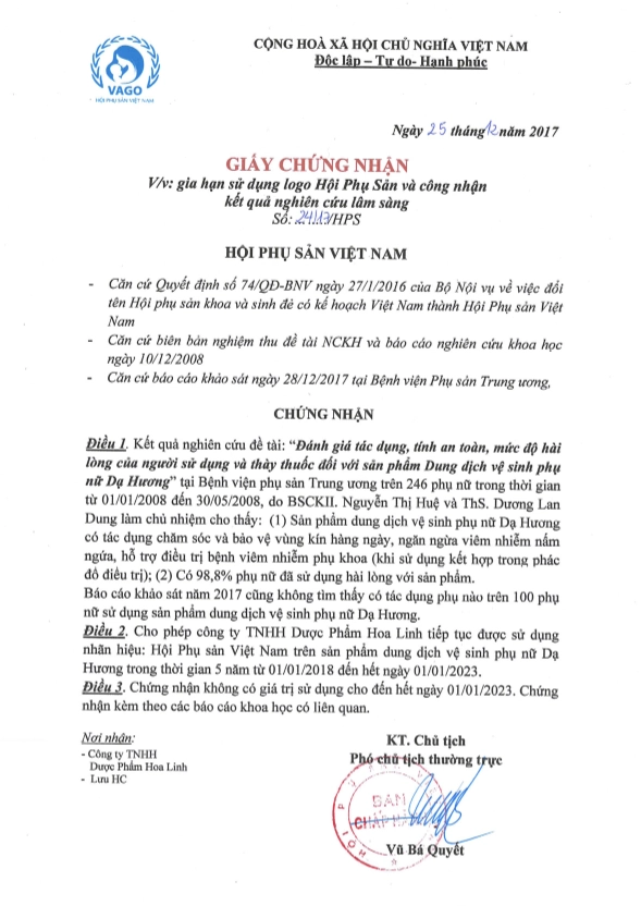 Dạ Hương là một trong số ít dung dịch vệ sinh phụ nữ được kiểm nghiệm lâm sàng. Vào năm 2009, sản phẩm đã được tiến hành kiểm nghiệm lâm sàng trên 250 phụ nữ. Kết quả cho thấy, có 98,8% bác sĩ và phụ nữ hài lòng khi dùng dung dịch.