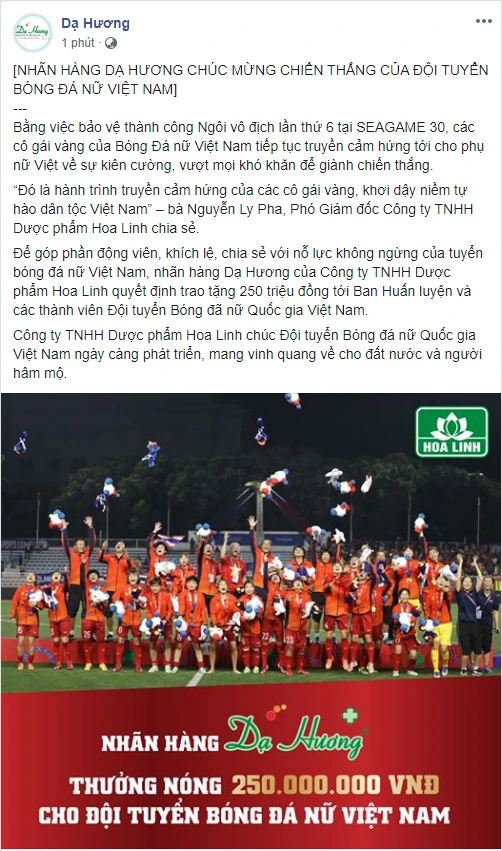 Đại diện nhãn hàng Dung dịch vệ sinh phụ nữ Dạ Hương thuộc Công ty TNHH Dược phẩm Hoa Linh vừa tuyên bố sẽ thưởng nóng cho đội tuyển bóng đá nữ Việt Nam sau khi giành Huy chương vàng môn bóng đá tại Seagames 30.