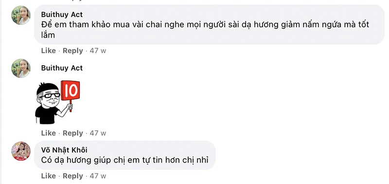 Mình đã tìm hiểu qua nhiều sản phẩm nhưng thật sự ưng ý với dòng sản phẩm DẠ HƯƠNG , Nhất là DẠ HƯƠNG hương trà xanh. Chiết xuất từ dâu tằm, vitamin B3, Collagen và hương trà xanh dịu nhẹ giúp mình cảm thấy luôn tươi mát, khô thoáng và sạch sẽ. , có nguồn gốc từ thiên nhiên nên rất dịu nhẹ phù hợp với độ PH phụ nữ Á đông . Chúc chị em luôn đẹp từ trong ra ngoài, từ trên xuống dưới nhé